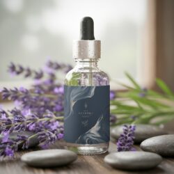 Showroom Label Design on Oil Dropper Mockup with Rustic Spa Decor