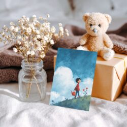 Kids Greeting Card Mockup with Gift Box and Cuddly Teddy Bear