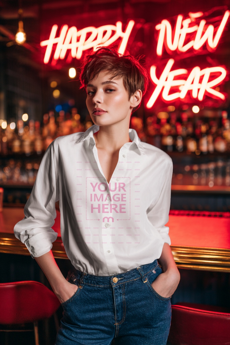 Button Shirt Mockup with Woman and Red Party Bar Lights preview image