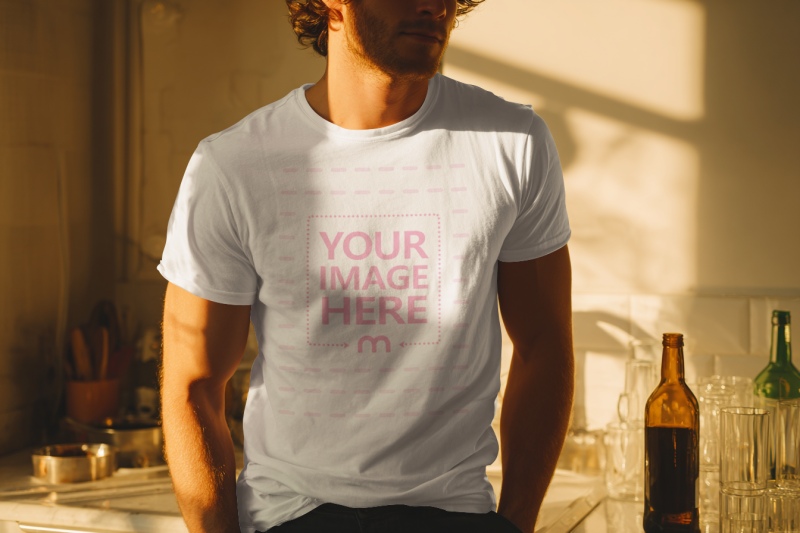 Close-Up T-Shirt Mockup in Kitchen with Glassware and Bottles preview image