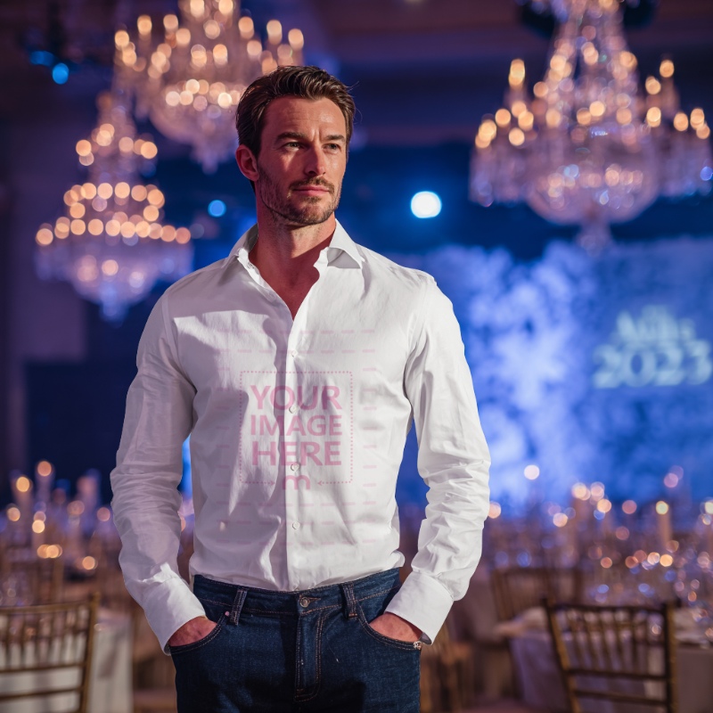 Collar Shirt Mockup with Man in Café with Bokeh Chandeliers