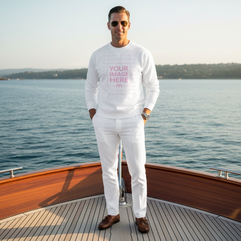 Crewneck Sweatshirt Mockup on Man Standing on Boat Deck