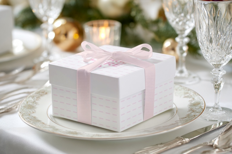 Gift Box Mockup on Dining Plate in Luxurious Christmas Setting