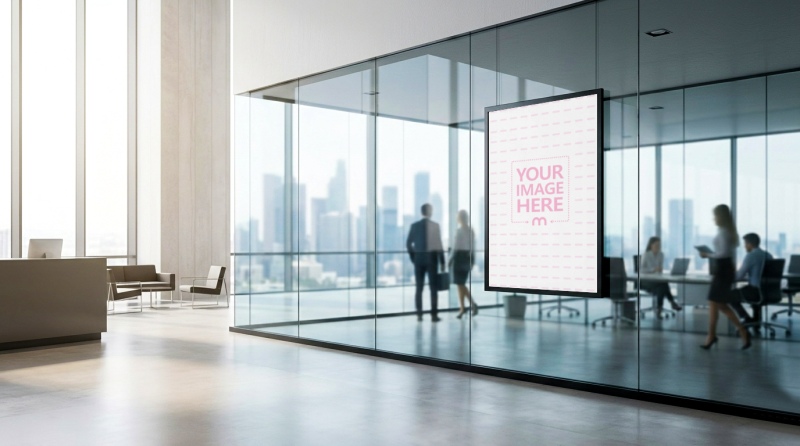 Hanging Poster Mockup in Modern Office Workplace