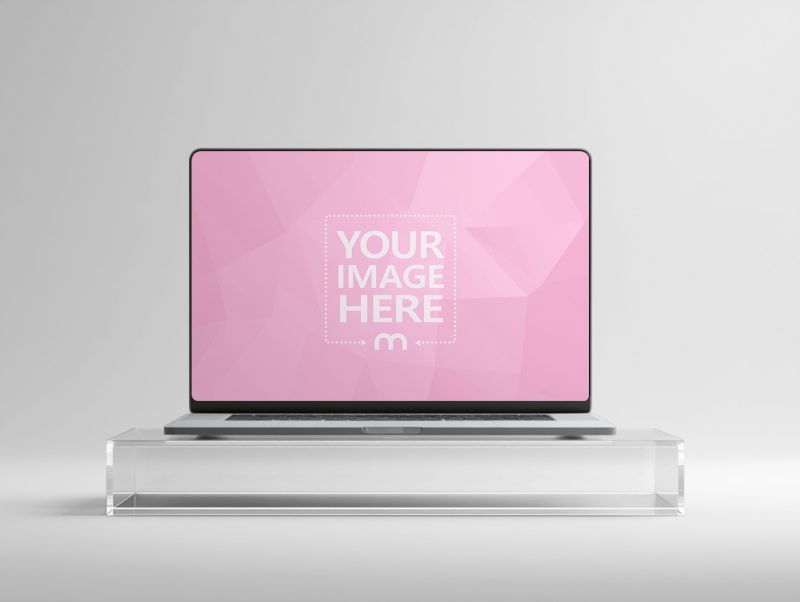 Laptop Mockup on Clear Acrylic Stand in Front View
