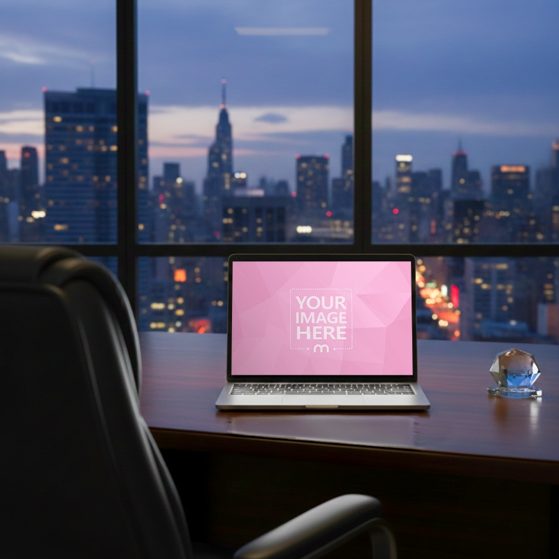 Laptop PSD Mockup on Executive Desk with City View