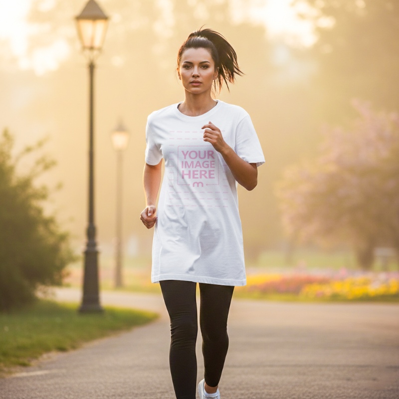 Tags:  oversized t-shirt | mockup | female model | running | outdoor | casual fashion | activewear | street style | comfortable clothing | summer outfit | trendy apparel | sportswear | lifestyle photography | urban environment | fitness attire | relaxed fit | stylish look | fashion photography | model photography | athletic wear | movement | dynamic pose