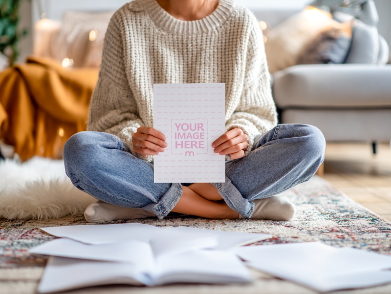 Paper Mockup Held by Woman Sitting on Cozy Interior preview image