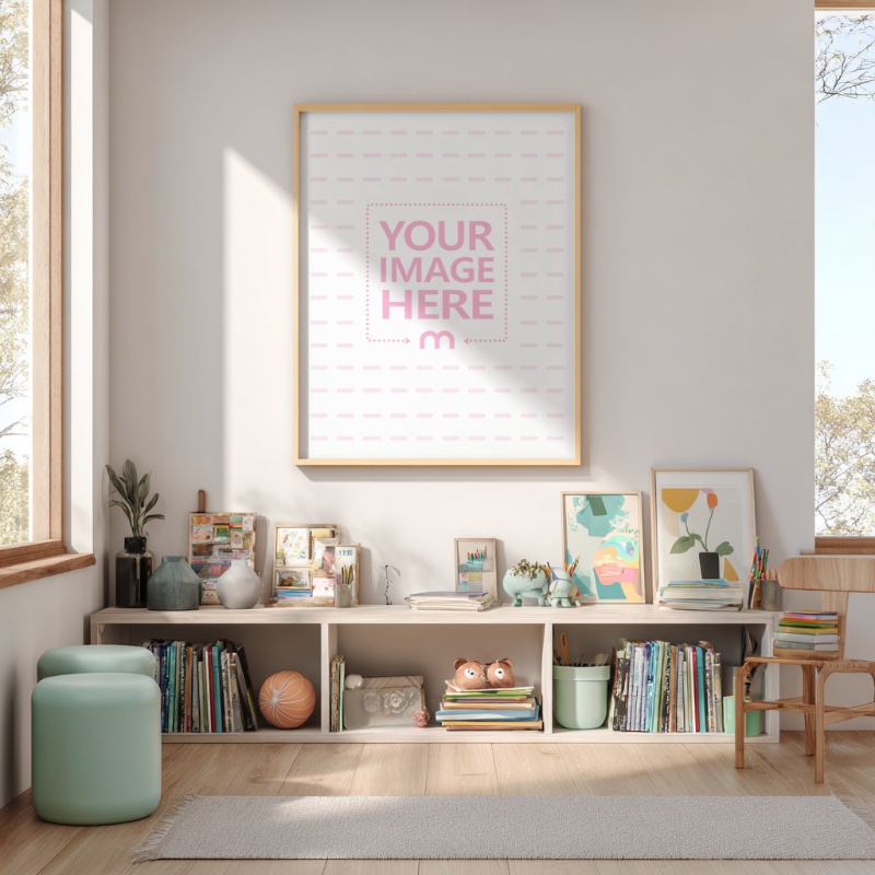 Tags:  psd mockup. mockup generator | poster frame | mockup | family playroom | toy storage | interior design | children's room | wall art | home decor | playful atmosphere | decorative frame | colorful toys | family space | modern design | art display | cozy environment | creative space | stylish decor | vibrant colors | playful design | child-friendly