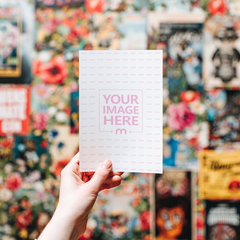 Poster Mockup Held by Hand Against Artistic Poster Wall preview image