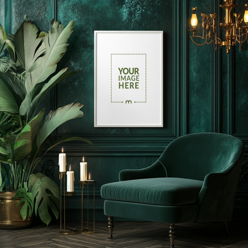 Tags:  dark green wall | art frame mockup | luxury art display | classic painting mockup | gallery style | home interior