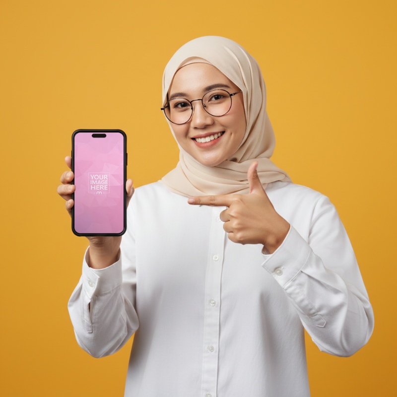 Tags:  smartphone mockup | woman in hijab | smiling woman | hijab fashion | mobile phone display | digital marketing | product showcase | lifestyle photography | diverse representation | cultural fashion | modern technology | user experience | branding | social media content | advertising | visual storytelling | promotional material | smartphone display