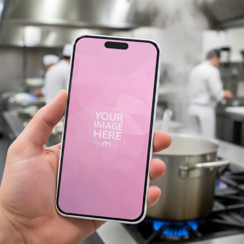 Smartphone Mockup Held in Busy Restaurant Kitchen
