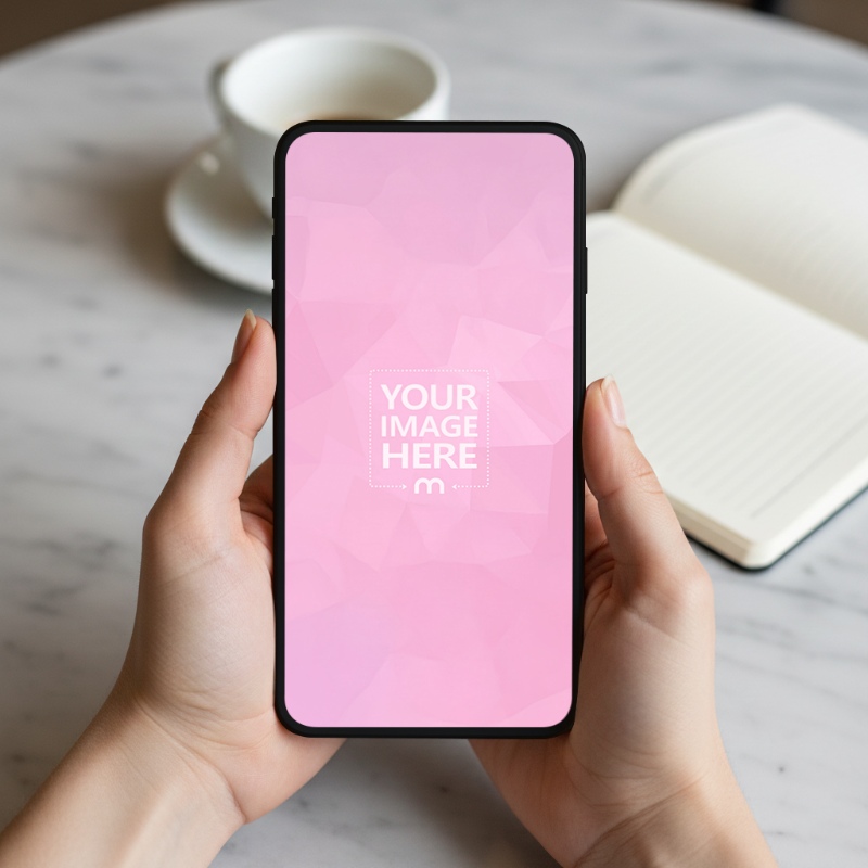 Smartphone Mockup Held with Both Hands in Café Table