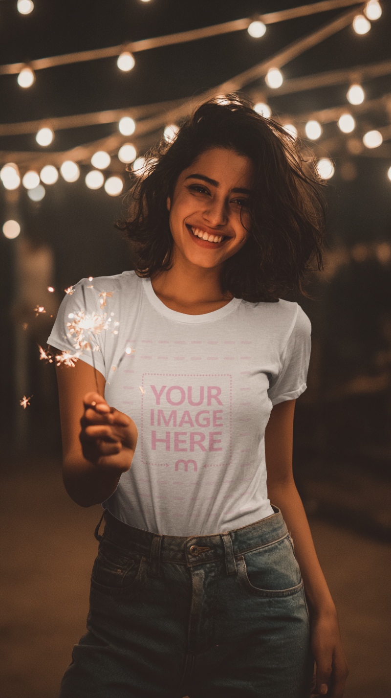 Tags:  psd mockup. mockup generator | t-shirt mockup | smiling model | fireworks | night | clothing design | apparel display | graphic tee | casual wear | summer fashion | festive atmosphere | outdoor event | vibrant colors | promotional material | branding mockup | festive fashion | new year design