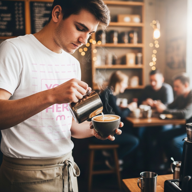 T-Shirt Mockup on Barista Pouring Latte for Café
