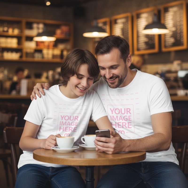 T-Shirt Mockup on Father and Son in Cozy Café