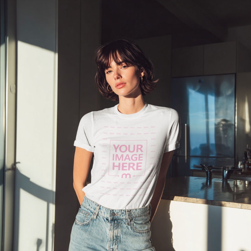 Tags:  t-shirt mockup | woman | sunlit kitchen | mockup template | apparel design | casual wear | fashion photography | lifestyle imagery | product presentation | branding | graphic design | home setting | natural light | clothing display | creative showcase | visual merchandising | relaxed atmosphere | stylish outfit | everyday wear | clothing mockup.
