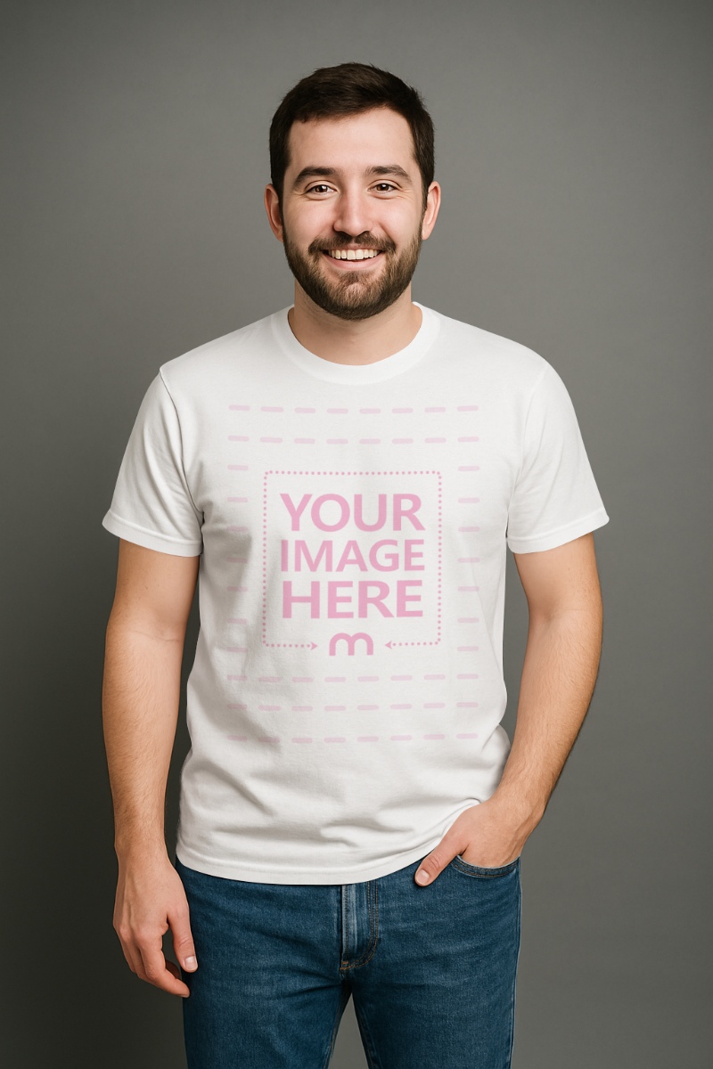 T-Shirt Mockup with Smiling Bearded Man on Gray Minimalist Background
