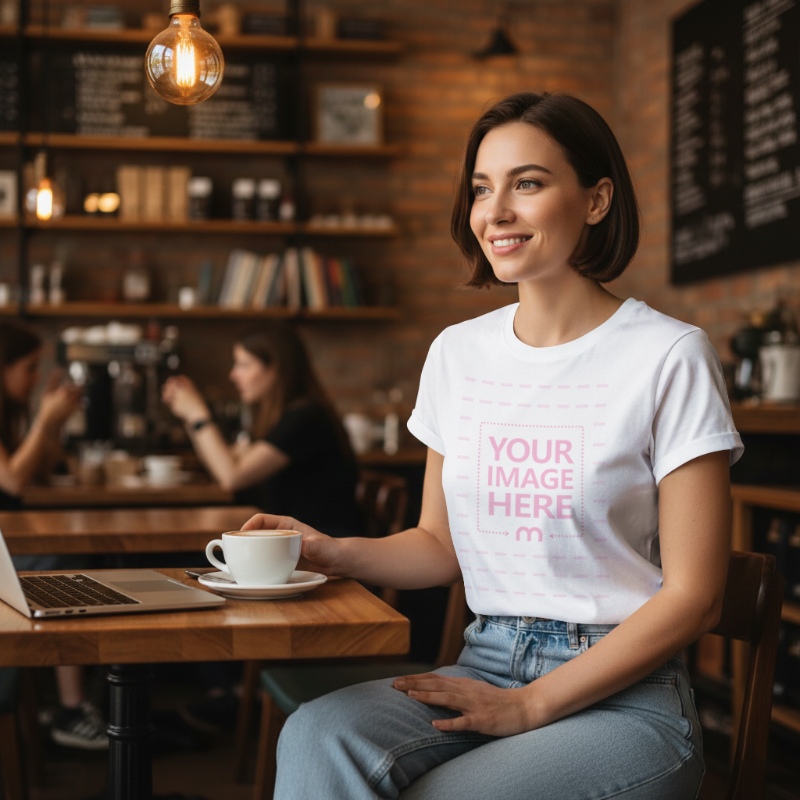 T-Shirt Mockup with Woman in Cozy Coffee Shop