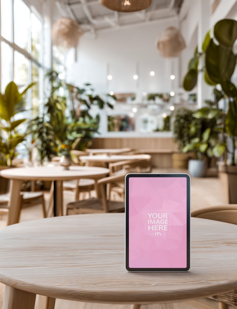 Tablet Mockup on Wooden Table for Cozy Café Branding