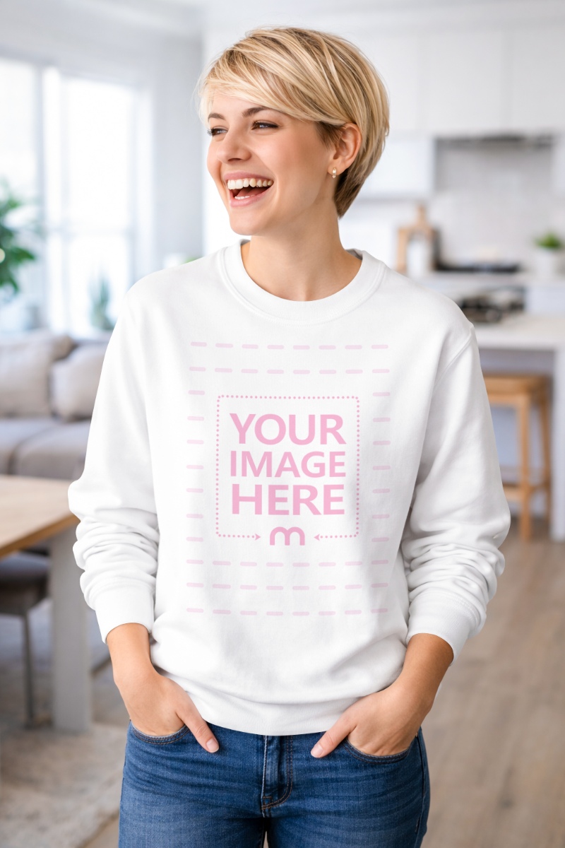 White Sweatshirt Mockup Worn by Woman in Modern Home