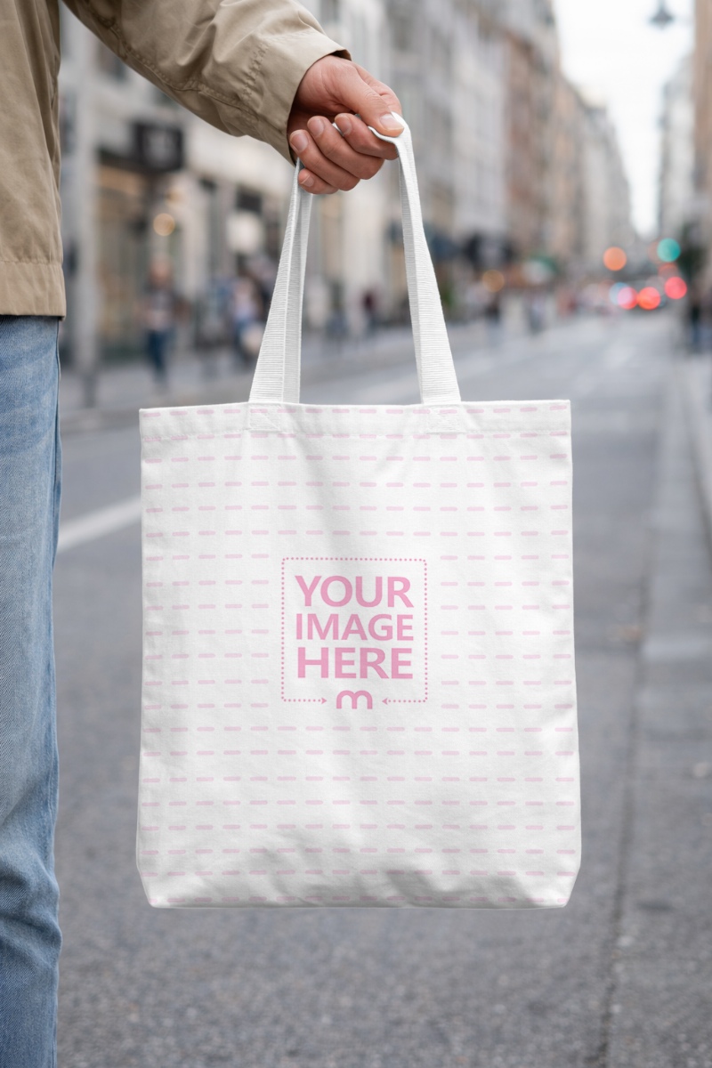 Tags:  white tote bag mockup | tote bag mockup | canvas tote bag mockup | tote bag held by person | tote bag in city street | realistic tote bag mockup | urban tote bag mockup | lifestyle tote bag mockup | white canvas bag mockup | bag branding mockup | fashion accessory mockup | ecommerce tote bag mockup | blank tote bag template | merchandise mockup | premium tote bag mockup